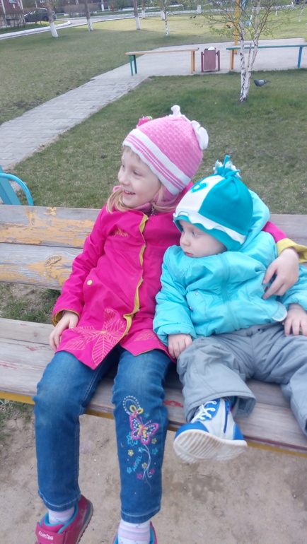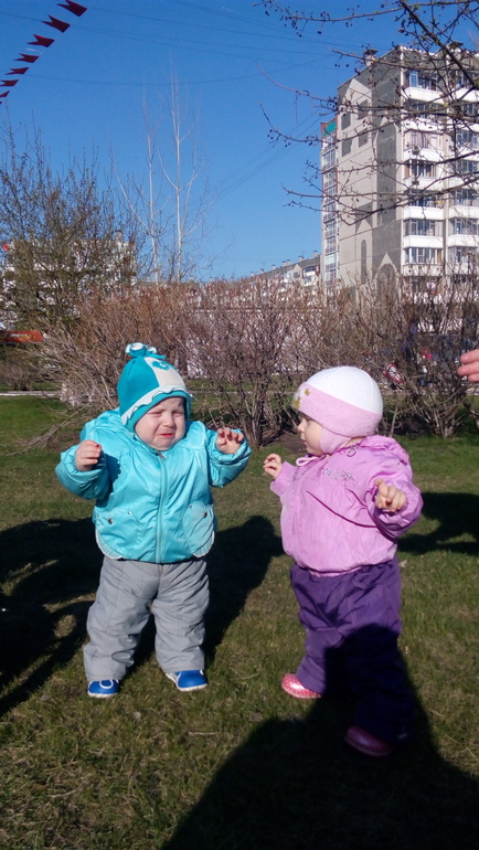У нас совсем нет тепла. Всю весну дети не вылазили из коляски, только пару раз на руках гуляли, пока Лера бесилась в парке на горках. Но совесть-то надо иметь) когда более-менее тепло, одеваем детей в легкие костюмы и ботиночки вместо больших и неудобных комбинезонов и вперёд) Варя - фанат ходьбы, ну это и не удивляет. Берет за руку, и водит, водит, водит. Нашла невысокий бордюр и раз 15 поднялась-спустилась. Яр - фанат ручек. Ходить пока не очень хочет, чуть-чуть, и ноги расслабляет - падает. Оба - фанаты горок и качелей.