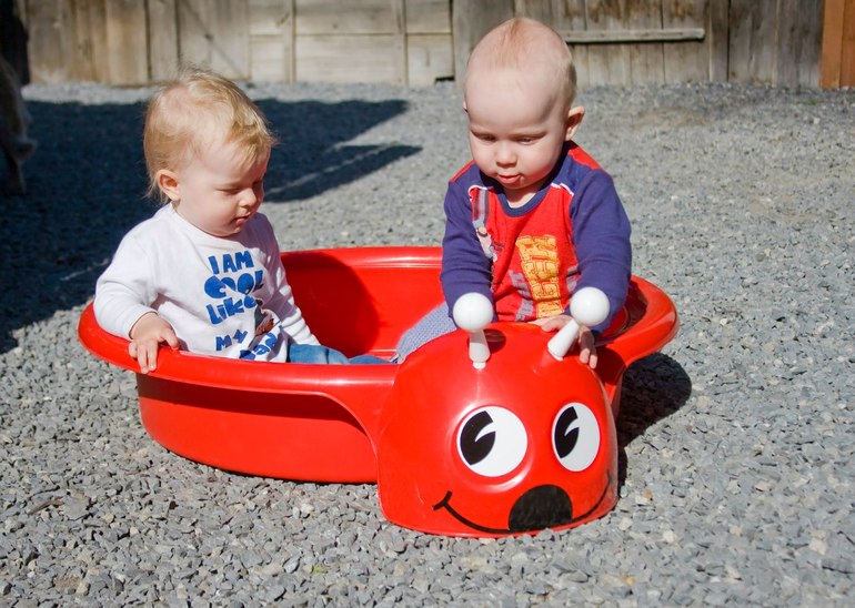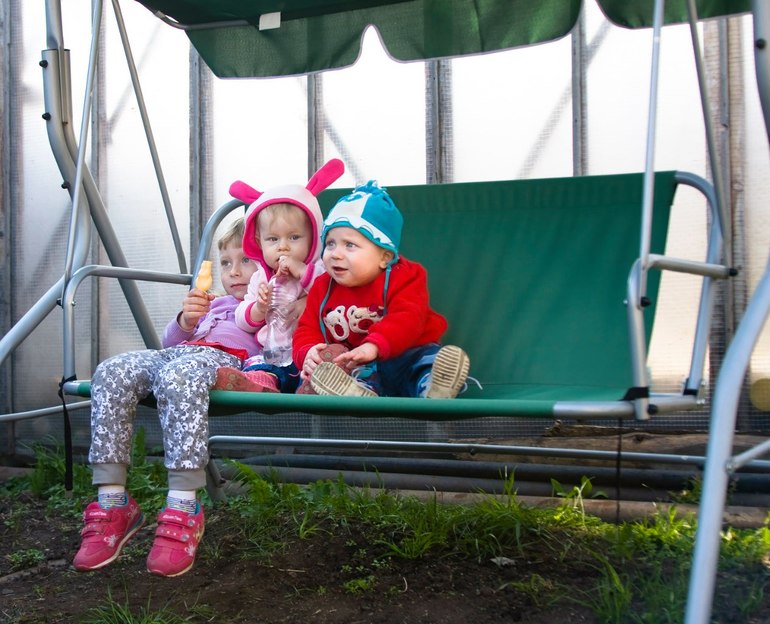 На даче есть много интересного для малышей: кошка, собака, трава, земля, теплица, качели, песок и маленький бассейн. Они не хотят сидеть в доме и всё время рвутся на волю - из дома в ограду, из ограды на улицу, а уж там свобода. Ярик ни за что не отпустит руку, а Варя уже готова самостоятельно нестись навстречу синякам и шишкам.