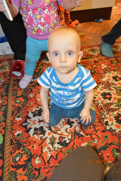 В гости пару раз к детишкам ходили. С рук тут же слазит, все изучает, со всеми на контакт идет....по спине погладит, постучит ладошкой)))
