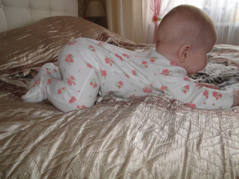 Встаёт на четвереньки, но не долго. Ползает по пластунски. Уже шустро переворачивается с живота на спину и обратно, крутится вокруг своей оси. Когда лежит на полу на коврике, уже быстро может оказаться вне коврика и начинает возмущаться и как я предполагаю на то, что скользко по ламинату и твёрдо. Когда лежит на животе смело опираясь на одну руку, тянется другой рукой к игрушкам что висят на дуге.