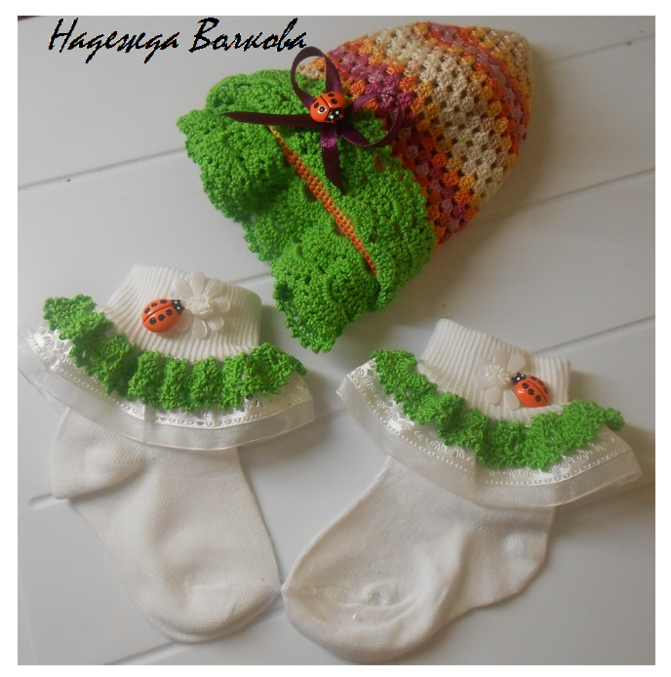Панамку уже показывала, но она была без бантика, как то одиноко мне показалось смотрелась божья коровка и я немного изменила. И в комплект к панамке украсила носочки