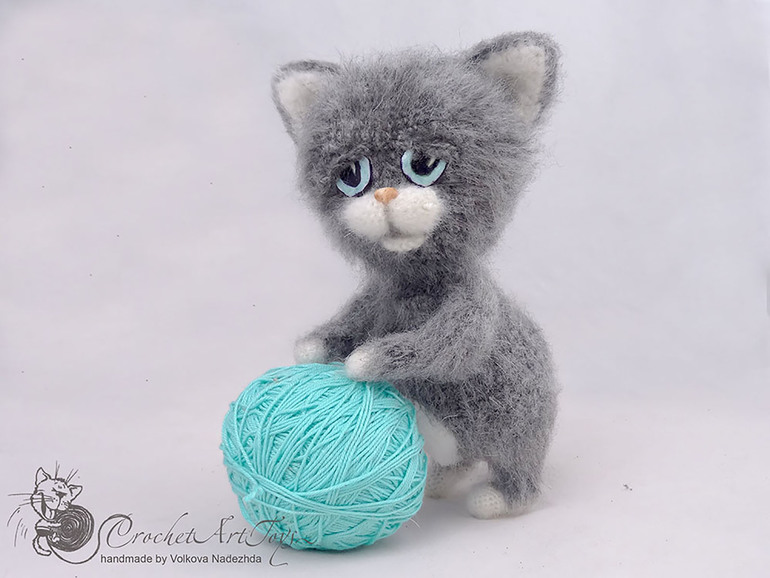 По описанию Илоны martik связался котик, пряжа бобинная мохерсодержащая, крючок 1.25, ростиком 18 см. На проволочном каркасе, конечности гнутся, голова на шплинте, поворотная. Тонирован сухой пастелью. Глаза и нос слеплены из полимерной глины.