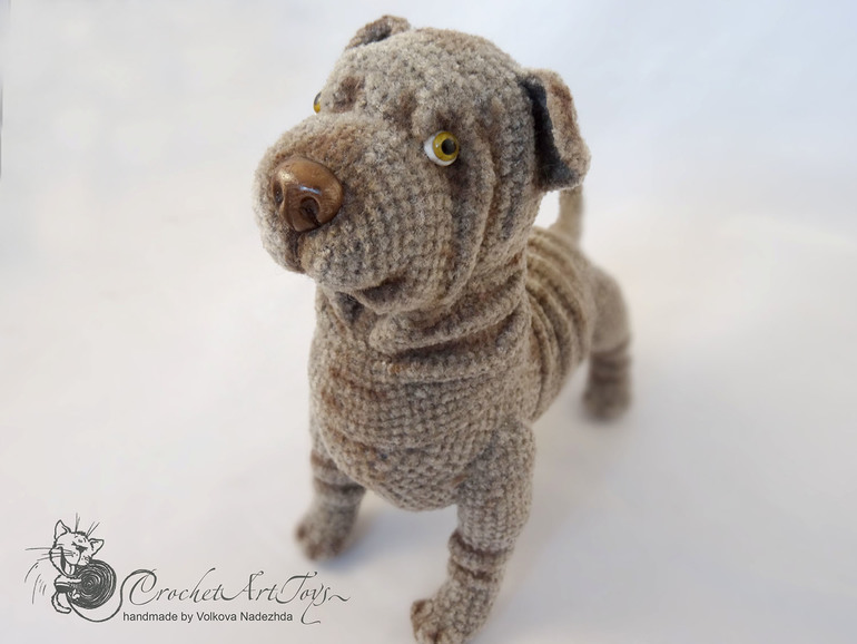 По мк Ольги Кинько связала еще одного Шарпея, пряжа велюр бобинный. крючок 1. Ростиком 16 см. Лапы, уши и хвост на проволочном каркасе. Тонирована сухой пастелью, нос слеплен из полимерной глины. Все складочки вывязаны, утяжка только на морде немного.
