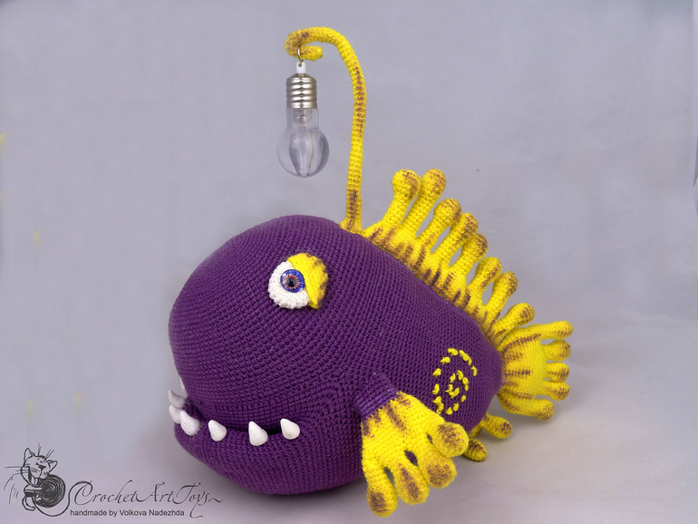 Чудо рыба -морской удильщик- связана по мк Александры simba из полухлопковой пряжи Котон голд и Новелти, крючок 1.25. Длина рыбы -около 25 см. "Удочка" на проволочном каркасе - подвижна, на конце мигающая лампочка, благодаря которой чудо рыба подсвечивается разными цветами. Зубы слеплены из полимерной глина, плавники тонированы масляной и сухой пастелью.