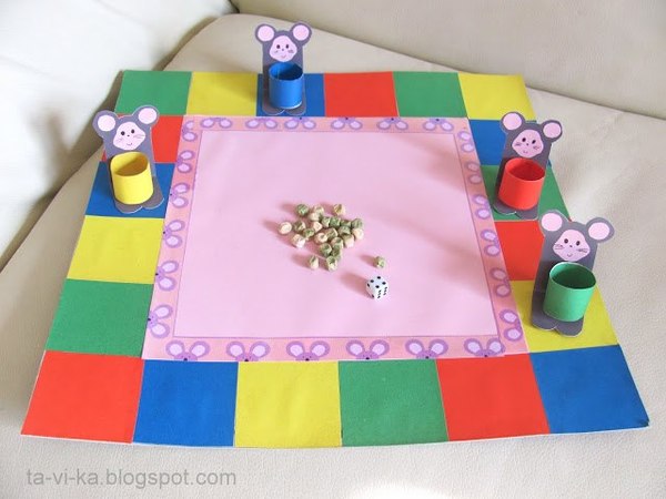 Бросаем кубик по-очереди и идем по квадратикам. Если останавливаемся на квадратике того же цвета, что и ведерко у мышонка, то кладем мышонку горошину из кучи, расположенной по центру поля. Ходим кругами без начала и конца, пока все горошины из кучи не закончатся. Потом считаем. У какого мышонка больше гороха - тот и выиграл.