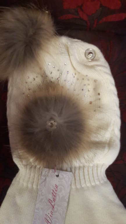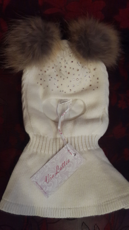 Меховые помпоны на шапочках полностью идентичны меховым опушкам на курточках. Шапочки выполнены из итальянской пряжи, куда входят такие составляющие как: ангора, кашемир, шерсть мериноса.