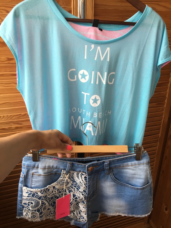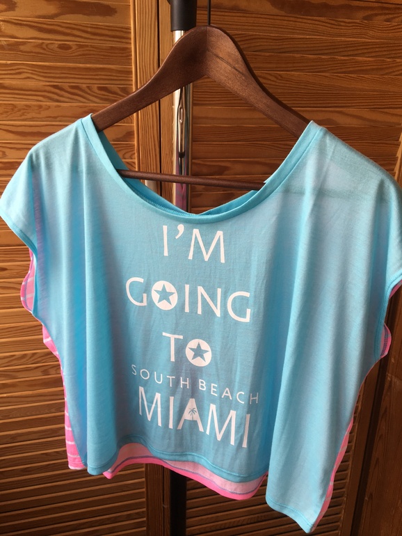 4. Укороченная футболка небесно голубого цвета с надписью I`m going to Miami. Спинка футболки контрастного неоново-розового цвета в белую полоску.