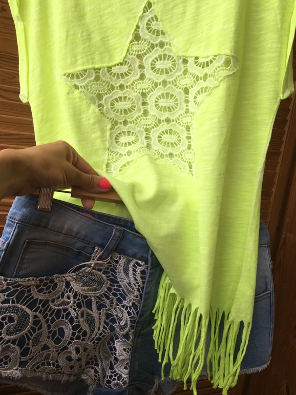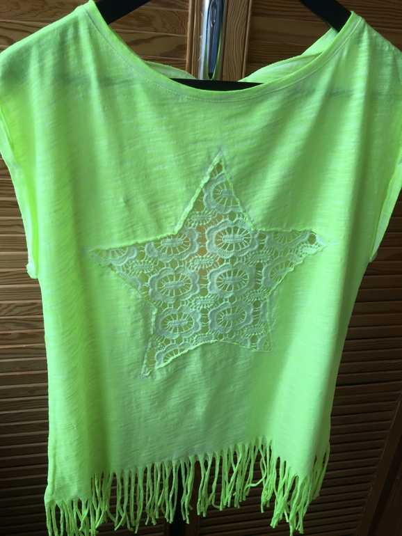 8. Женская футболка салатового цвета со звездой выполненной из кружева на груди.