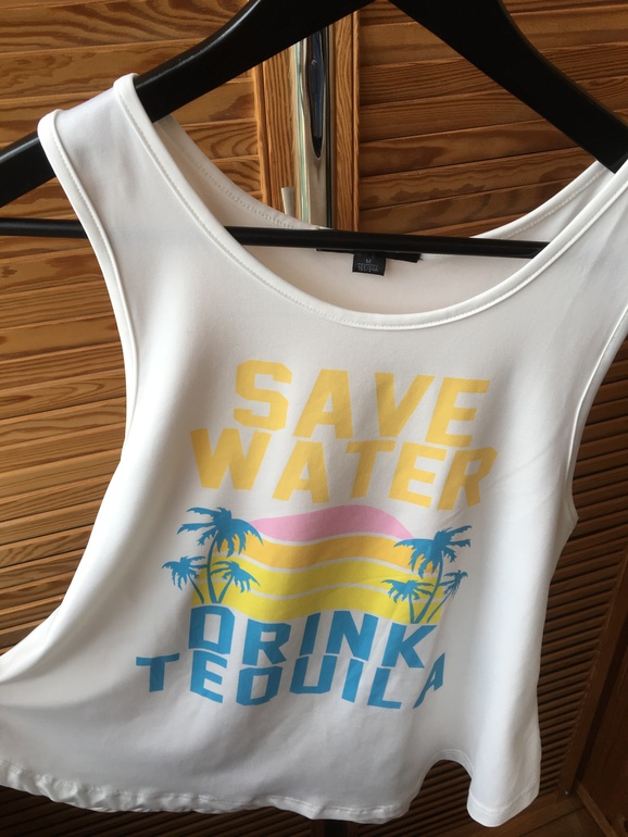 2. Футболка с оригинальным принтом "Береги воду -пей текилу". Расклешенная к талии. Состав: 65 % эластан 35% полиэстер Длина 60см Вес: 220гр 600р 2 шт в размере М (44/46)
