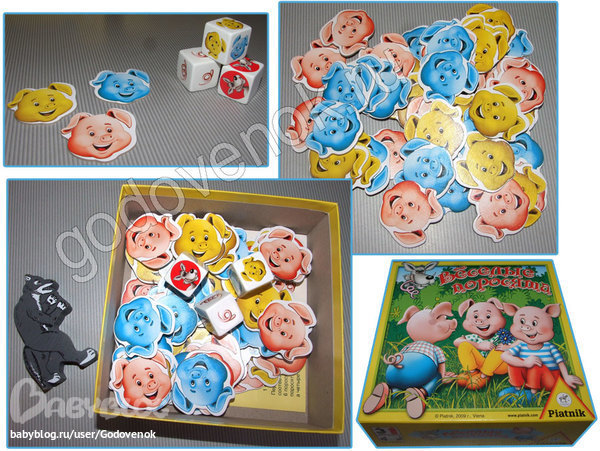 В комплекте игры 48 поросят разных цветов (розовый, голубой и желтый по 16 каждого цвета) и три кубика. На одном кубике -мордочки поросят (розовые, голубые, желтые: по две каждого цвета). На втором - поросячьи хвостики с одним, двумя или тремя завитками. На третьем кубике на двух гранях изображение волка, а остальные грани пустые. Изначально все кубики «голые», без картинок. Нужные наклейки на грани надо наклеить самим после того, как игра будет распакована (у меня этим занимался Ваня).