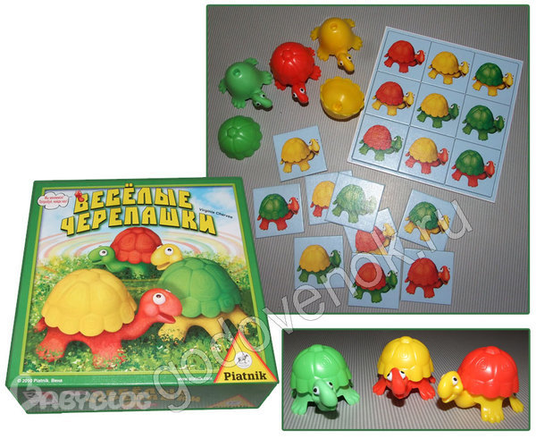 Правила игры следующие: ведущий собирает черепашку, а игроки, переворачивая по одной карточке, должны найти ту, на которой изображена точно такая черепаха. Кто первый нашел, тот и забирает себе карточку.Маленьким детям, на мой взгляд, очень сложно смириться с явным проигрышем и отдать карточку тому, кто первый ее нашел. Поэтому по этим правилам мы не играем, а придумывает свои.