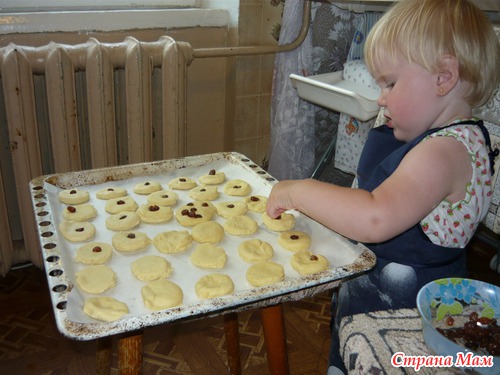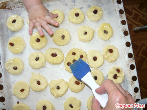 Выложить на противень на бумагу и украсить изюмом (можно орехами, курагой, черносливом, шоколадом - что есть)![]()