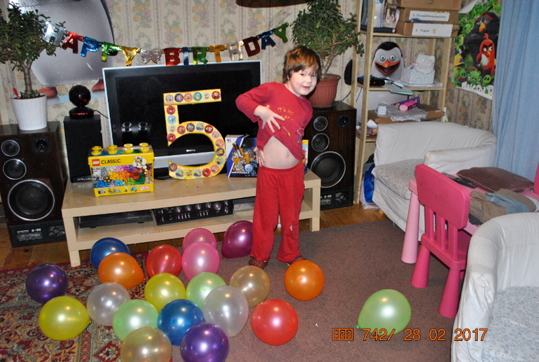 Справили день рождение, хорошо что папа был с нами) Утром подарки и украшенная комната, после поехали в развлекательный центр, а потом в макдак, дома празднично поужинали. Мы сделали тортик, но нам подарили в рамках программы торт ребёнку инвалиду ещё один тортик, тачки Маквин. Филька в восторге был и девчёнки тоже, тортик вкусный вышел. Пятерку сама делала, на фото не очень, но в живую симпатичная, покрасила золотой краской, а на неё кружочки с миньенами из чипи као)