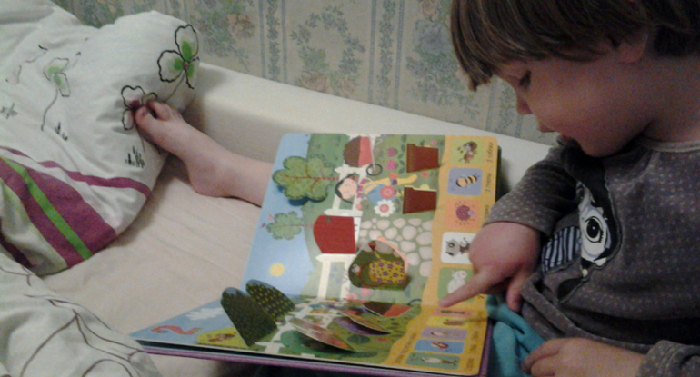 Играем в детское лото, сам называет и сам кладет фишки мне или себе, а если нет такой, говорит нет.