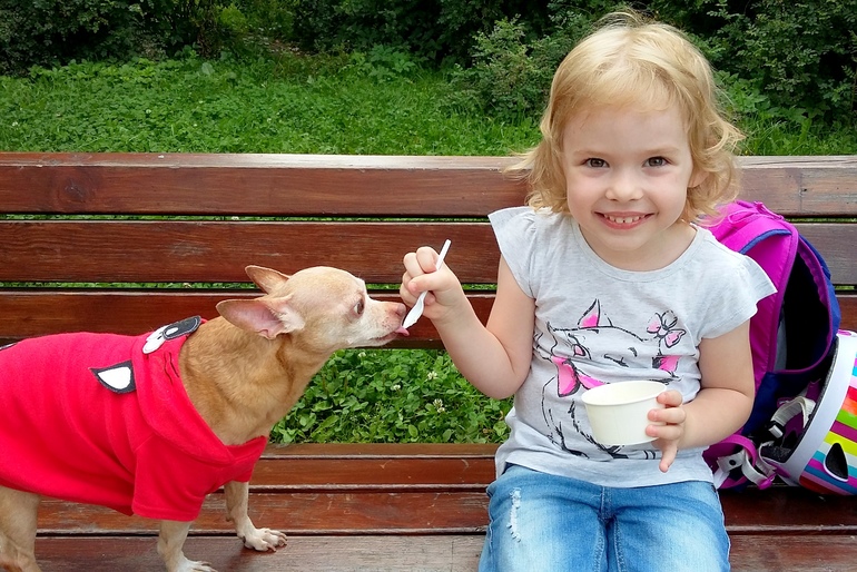 В пятницу гоняли на самокатах и как же не сделать перерыв на мороженое (очень вкусные поставили палаточки с мороженым Булка, один шарик 70 руб, натуральное мороженое), а уж поделиться с любимым пушистым другом - бесценно