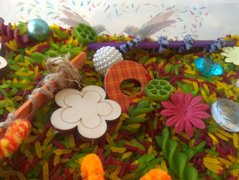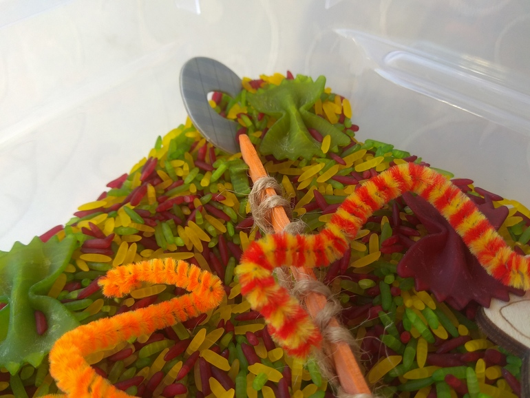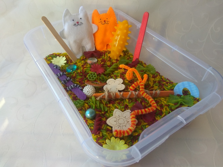 Сенсорная коробка состоит из различных материалов - рис, фасоль, дерево, ткань, декоративные камни и др. Играя с разными материалами, у ребенка развивается мелкая моторика, что благоприятно влияет на умственное развитие, развитие речи. Два котика являются уникальными: они наполнены разными материалами (вата и фасоль), сшиты автором самостоятельно. Также детям будет интересно играть с "ежиком" - перекатывать его по ручке, ладошке, ножке. Рис, макароны покрашены пищевыми красителями, что исключает окрашивание ручек Вашего малыша. Входящие в набор ложечки, баночка, ведерко сделают игру особенно веселой- каждый ребенок любит играть с сыпучими материалами.