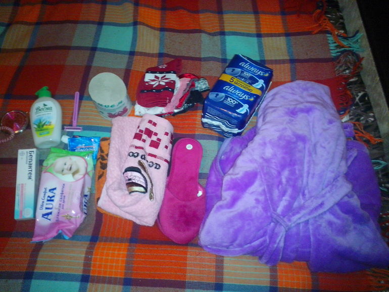 Мне говорили мало вещей бери еще!Но то что я взяла то и пригодилось не больше не меньше!Прокладки подошли такие и совсем незачем было брать специальные как с ведра не текло)я взяла еще с собой косметику выписалась на 7день! Взяла я правдо еще шампунь и воду!Вода не нужна была пить нельзя было.