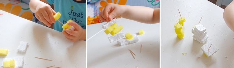 Очень интересно наблюдать за процессом. Например, один деть делает исключительно фигуры "низ-палочка-верх", а другой нанизывает "шашлычки".