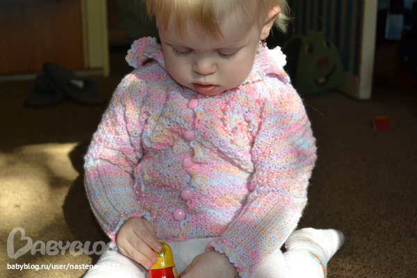 Вот вчера закончила кофточку,пряжа "детская" акрил,400 метров было,осталась одна треть гдето. Правда поймать Настю немогла,чтобы сфотографировать хорошо,ну я думаю,и так понятно будет)))