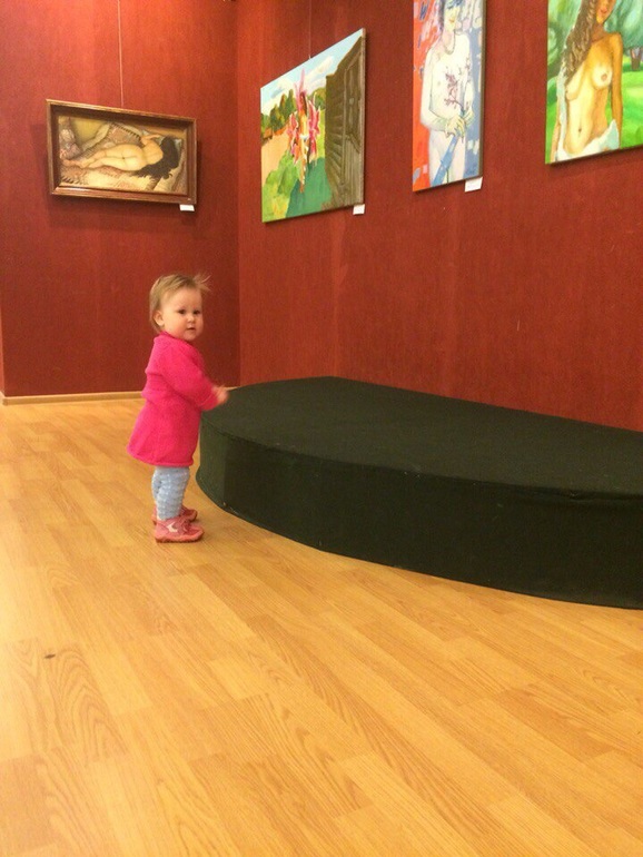 Доченька СофушкаВ выходные, 21 мая ходили в наш выставочный центр на концерт арфы. Дочка нашей знакомой арфистка. Софа спокойно посидела минут 20, хлопала в ладоши и раскачивалась в такт. Потом, что бы не мешать остальным, пошли в другой зал с картинами.
