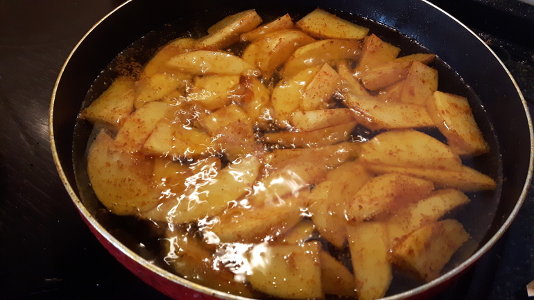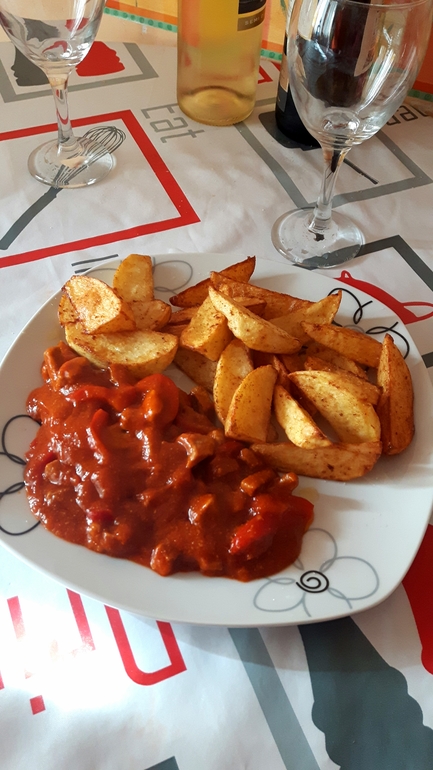 Картошку почистить, порезать на 6-8 долек, посыпать специями ( карри и паприка) и жарить в кипящем масле минут 10-15 до готовности) потом на тарелке посыпать солью и молотым чёрным перцем ( если кто хочет поострее)