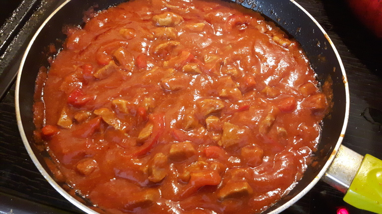 Мясо порезать на маленькие кубики, обжарить минут 5 на большом огне, потом тушить с закрытой крышкой на медленном огне, порезать перец болгарский тонкими полосками ( кому нравится можно кубиками) и добавить к мясу, тушим пока мясо не станет очень мягким и перец тоже, добавляем специи: соль, перец, чеснок сухой (или свежий) и достаточно много тмина. Когда перец стал мягким то добавляем томатную пасту и ещё минут 10 готовим)