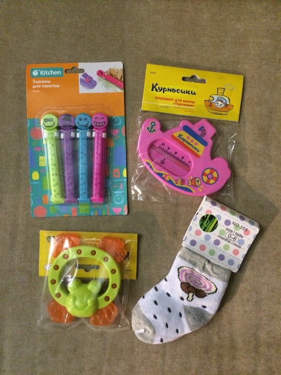 Прикольные зажимы для пакетов, детский термометр для ванны нашей ляле, игрушка грызунок в виде лягухи и тепленькие очень мягкие и красивые носочки для нашего карапузика