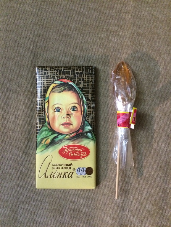 И конечно же сладости))) Моя любимая шоколадка Аленка и леденец на палочке в виде рыбки)))