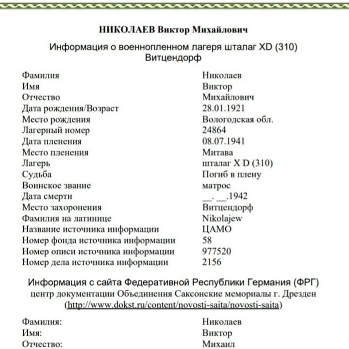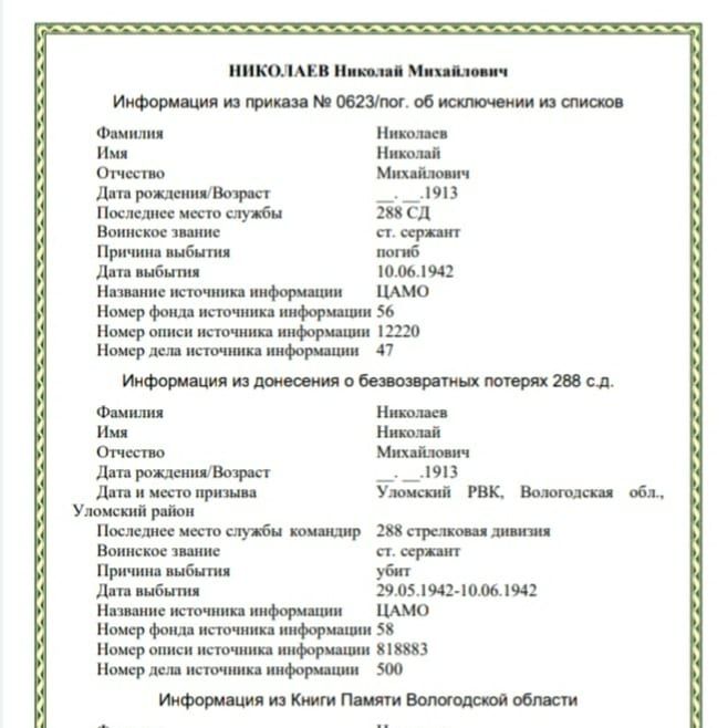 А еще два дяди бабушки погибли за Родину Николаев Виктор Михайлович и Николаев Николай Михайлович