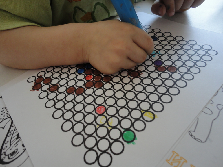 В последнее время очень любит рисовать. Неважно чем, но в приоритете краски и цветные ручки/фломастеры. Красками такие картины пишет, прям жалко выбрасывать. Складываю в папочку. Говорит, что рисует северное сияние. Правда похоже. Месяц назад заметила, что в одной раскраске сынок стал очень аккуратно раскрашивать небольшие кружочки(фары на машинах), прям очень аккуратно, старательно не вылезая за контур, ну почти. Стала я ему подсовывать картинки с обилием этих самых кружков(нашла в интернете), так он так этим увлекся, ничего больше для счастья не надо. Кстати, обратила внимание, что раскрашивает поочередно левой и правой рукой... Хотя ведущая обычно правая была всегда.