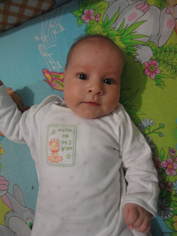 Доченька растет. В 2 месяца 5700г и 60см. Такая упитанная крепенькая плюшка. Много улыбается, агукает-окает, радуется, когда видит папу/маму/братика, а вот на всех остальных смотрит с подозрением, хмурясь.
