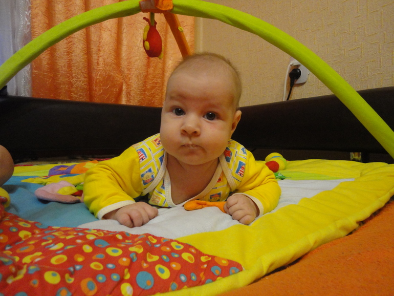 Переворачиваться со спинки на животик начала ровно в 3 месяца. Голову держит неплохо, но иногда "клюет" носом. На животике лежать нравится, особенно если перед глазами маячит-скачет-вопит старший брат, который гораздо интереснее всяких погремух, мобилей и прочих малышковых приблуд.