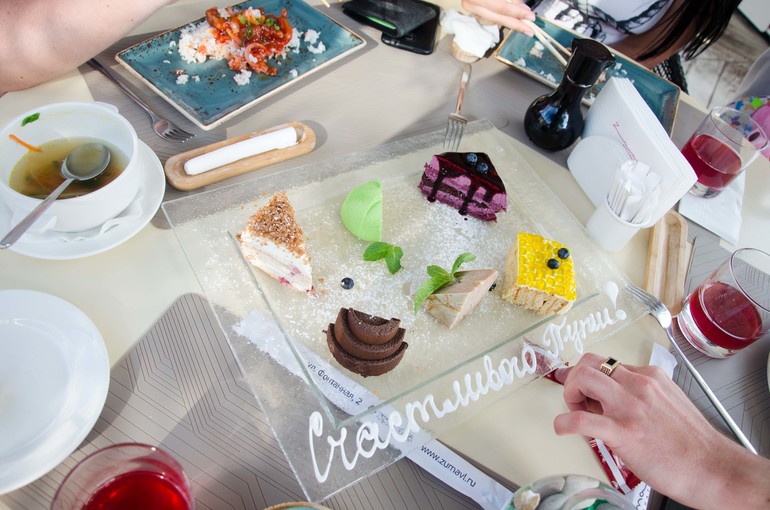 Здесь хочется провести как минимум целый день.. Чтобы надышаться океаном! Ну а нам пора в сторону железнодорожного вокзала..В нашей программе остался еще один пунктик - уж очень наш друг хотел, чтобы мы его посетили. Модное место Владивостока - паназиатский ресторан Зума. У нас оставалось чуть более часа до поезда, и мы практически бегом поехали в ресторан, чтобы успеть хотя бы на бизнес-ланч... По дороге друг Серега проинструктировал свою жену - Иринку: "Так, мы сейчас ищем парковску, а ты быстро забегай в ресторан и прям с порога заказывай 4 бизнес-ланча!" Иришка забежала в ресторан за 5 минут до окончания времени бизнес-ланча, за ней побежали и мы. Наверно, администратор подумала, что мы - две сумасшедшие семейки с детьми и решила нам не отказывать))). Мы устроились на втором этаже - уютной светлой веранде. Впервые за весь отпуск не было сил фотографировать)) Хотя и нужно было бы) очень душевная там обстановка! Очень вкусная еда! Напоследок совершенно неожиданно для нас принесли потрясающие десерты - подарок от ресторана - и пожелали нам счастливого пути!