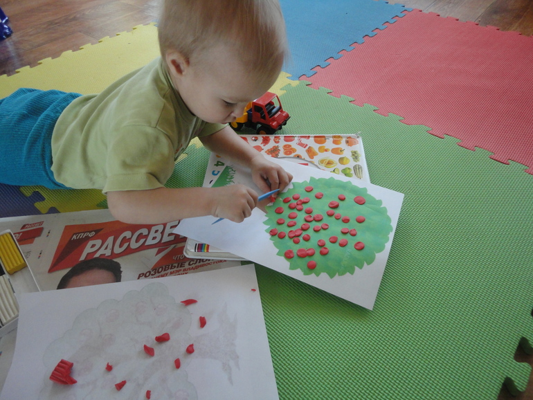 Вчера я впервые дала своему ребенку пластилин. Вот такая нерадивая, или скорее ленивая, я. Просто не знала, на какой козе подъехать с этим делом к дитю, считала, что еще рано. Но оказывается сейчас самое время! Сынок без ума от пластилина. Просто не видно-не слышно(ну почти) человека 2,5-3!!!!!!! часа подряд. Сидит, ковыряется ножичком, нарезает колбаску, отщипывает кусочки, лепит в строго отведенное место)) Вот чем мы вчера занимались(немного фото). Распечатала яблоню на бумаге, а сынок лепил на неё яблочки. Занятие поглотило его на целый день, с перерывом на поесть и поспать.