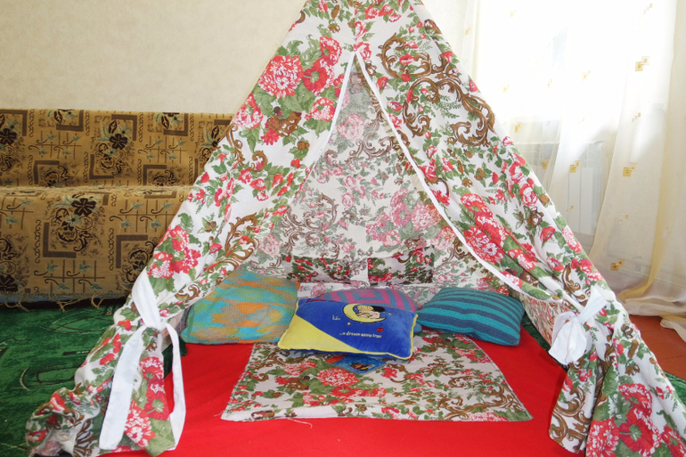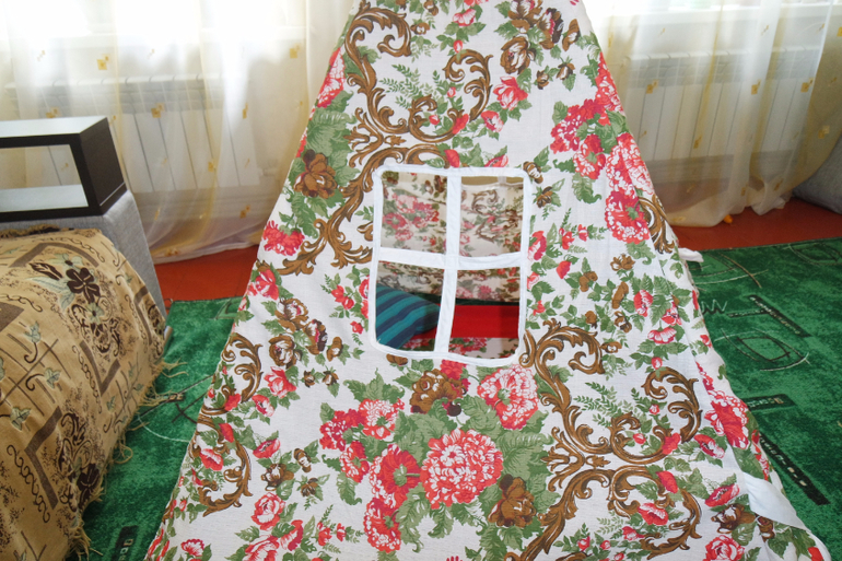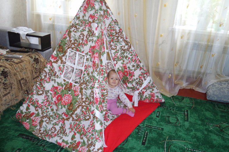 ШитьеУвидев здесь когда-то такой домик сразу захотела своим такой же. Прошерстив залежи имеющихся тканей нашла такую расцветку. 4 часа работы и вуаля! - у нас тоже есть такое чудо! Я результатом довольна, хотя есть куча огрех, но мы всей семьей(!) туда влезли и весь вечер провели в нем.