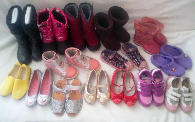 Разбирала я тут шкаф и выложила всю обувь. Еще не хватает 2 пары босоножек Экко, она в одних в саду ходит в других ушла.