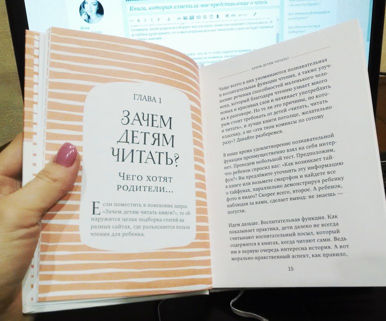 ...Дальше по нарастающей... Автор простым языком с примерами рассуждает о том, что поможет полюбить чтение. Не навязывание. А поддержание интереса ребенка, как и во всем. Очевидно? Конечно! Только за рутиной бытовых дел и гонкой за "НАДО" я (мы) не всегда замечаем очевидное((.