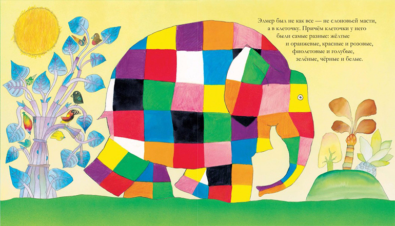 машинная вышивкаЖило-было стадо слонов. Слоны молодые и пожилые, высокие толстые и худые. Слоны такие, сякие, пятые и десятые - все разные, но все счастливые и все одного цвета. Ну, то есть все, кроме Элмера. Он был не как все - не слоновой масти, а в клеточку. Причём клеточки у него были самые разные: жёлтые и оранжевые, красные и розовые, фиолетовые и голубые, зелёные, чёрные и белые...
