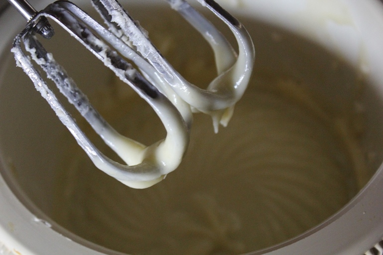 Взбейте 2 желтка без пленки с 185 г сахара, влейте 125 г молока. На небольшом огне, постоянно помешивая, доведите до кипения. Варите минут 7 до крупных пузырей (мешать не переставайте). Смесь станет белой и густоватой, как сгущенка (я не так круто уваривала). Перелейте в мисочку и дайте остыть.