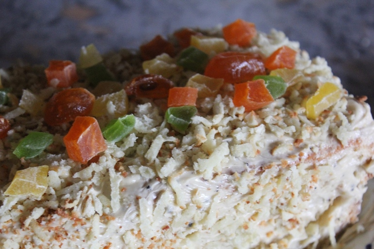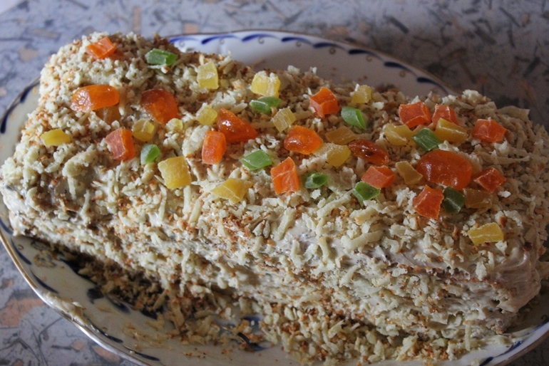 Помните, мы там уголки обрезали? вы их раскрошите элегантно блендером или там по-пролетарски, на терке потрите и обжарьте до золотистости на сухой сковороде (мешайте только, мешайте, горят быстрее спички). Обсыпаем этой аппетитной крошечкой нашу "Сказку", у кого остался крем ( у меня никогда не остается, но люди не такие жадные до начинки говорят другое) - можете там розочки выдавить ,как в магазине. Я нарезала цукатов разных и щедрой рукой посыпала. Но я вообще украшать не мастак.