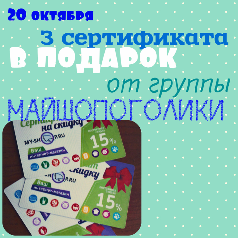 В этот раз победителя будет сразу 3!!!!!!!! А подарком станет сертификат на постоянную скидку 15 % в интернет магазине http://my-shop.ru