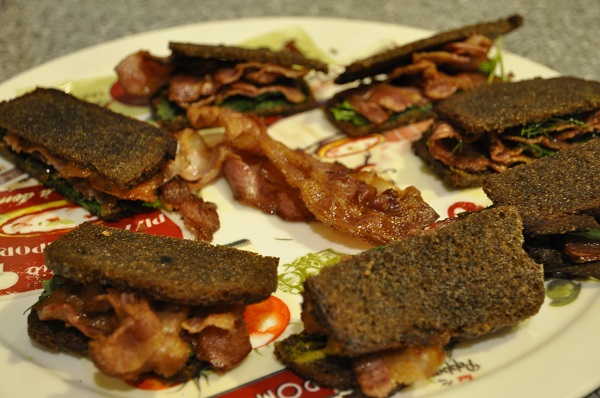 потом так-хлеб обжаренный и горячий,масло сливочное(еще была горчица,паста из вяленых помидоров.несколько видов делала),потом травки(рукола,салат,горчица,укроп),потом горячий бекон,сверху опять обжаренный хлеб.хлеб я резала слайсером,потому кусочки все одинаковые,не толстые.