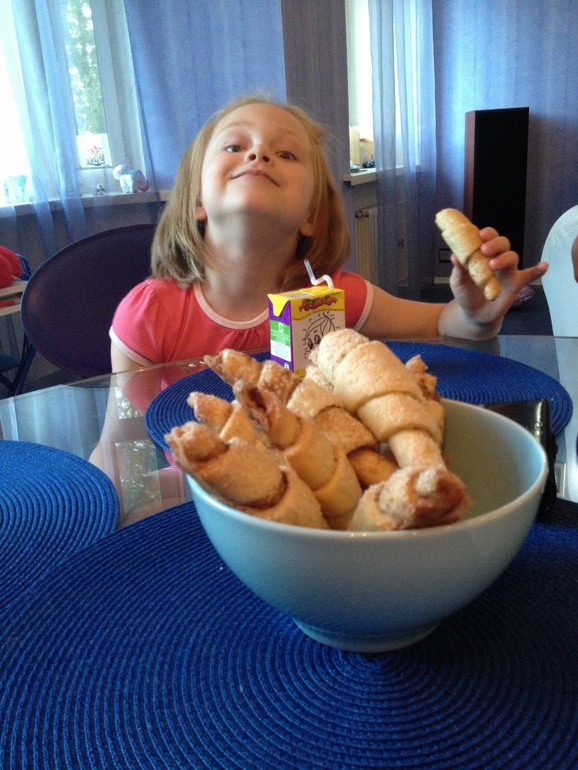(и я ее понимаю, дома стоит такой запах рогаликов, ммммммм!, что я сама потихоньку ползу на кухню :))))) и хоть время уже позднее, но мы собираемся за столом и пьем чай....я думаю, через много лет именно эти рогалики будут вызывать у моих детей воспоминания о детстве и о маме :)....и рецепт, такой простой и такой душевный, записан в нашей семейной кулинарной книге, где хранятся мои фамильные "драгоценности")