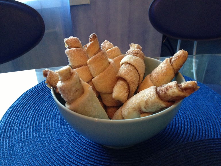 Доставать по одному шару, раскатывать его в тонкий круглый пласт (толщиной примерно 2 мм), посыпать щедро сахаром и корицей (а вообще, чем душа желает), резать на клинья как пиццу, на 8 секторов, скатывать от широкого края в рогалики. Выкладывать на пергамент на противень (у меня на два противня из этого количества) и выпекать при 180 С минут 20-30 (смотрите сами, духовки разные).