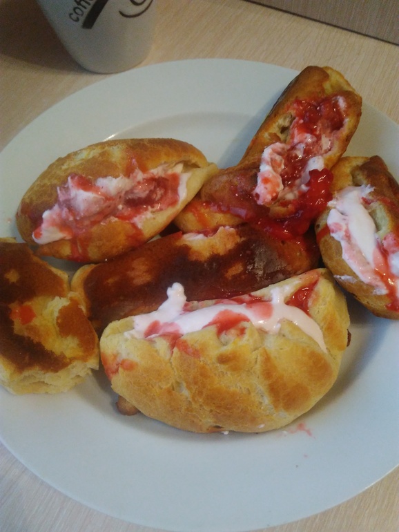 Духовку разогреваем до 200 градусов, ставим эклеры, как подрумянятся , вынимаем, остужаем, начиняем кремом . Я просто разрезала пополам не до конца, можно с помощью кондитерского мешка . Все) Давала Герману, он оценил. Плюс ыюв том, что ягоды можно заменить на те, что нравятся.