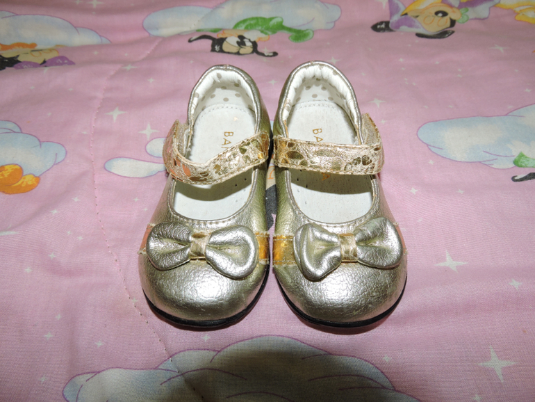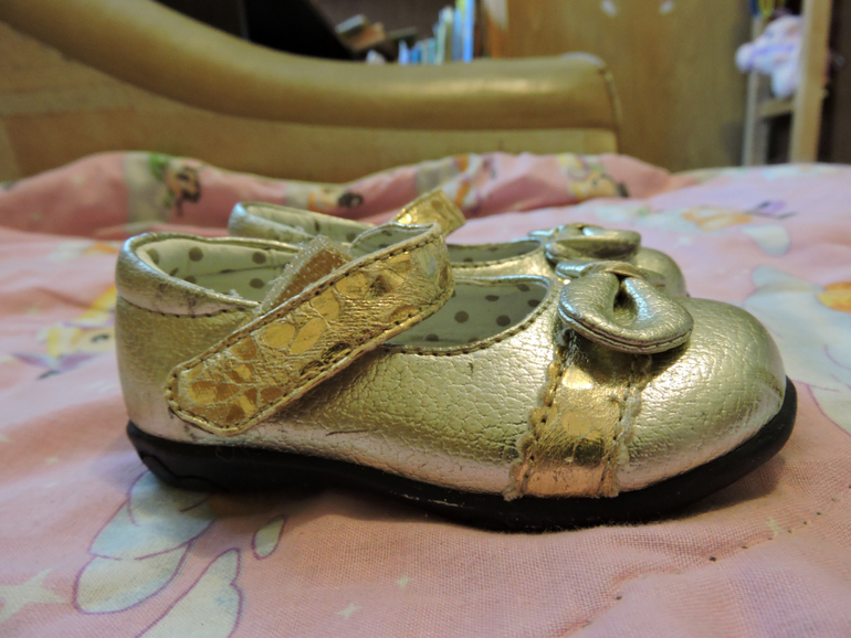 №8 Золотые туфельки для маленькой принцессы "Banana". 19 размер, 11,5 см по стельке. Одевали 3-4 раза. Несколько царапин на носках и задниках, фотоаппарат не берет. Стелька из натуральной кожи, верх помоймую тоже, но не уверена, не помню. 200 рублей