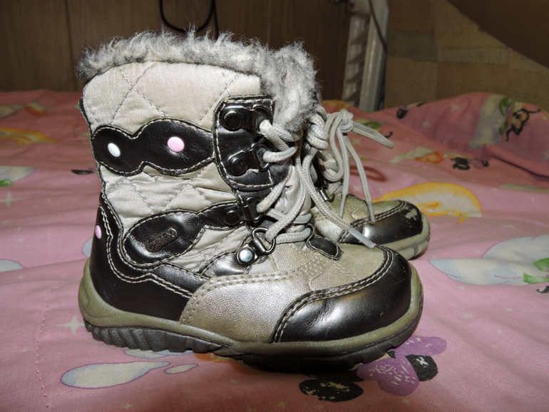 №5 Зимние мембранные полусапожки "Капика", 22 размер. Для дома, луж и активных прогулок. Одна из самых наших удачных покупок. Реально не промокают - ребенок заходил в лужи чуть выше шнурков. Намокали только шнурки и внешний текстиль, сапожки изнутри и нога были сухими. На фото видно - носы потерты, задники нет, мех сверху потрепан. Изнутри в идеальном состоянии. 100 рублей.
