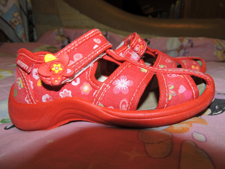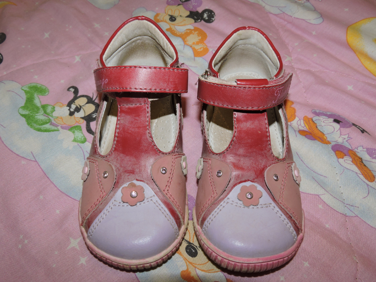 №3 Босоножки на девочку 26 размера, кож зам, одевали 5-6 раз и только в садике в группе, т.е. по улице не ходили ни разу. Из нюансов - маленькое пятнышко заводского клея на 1 цветочке - такими и покупали (фото). 200 рублей