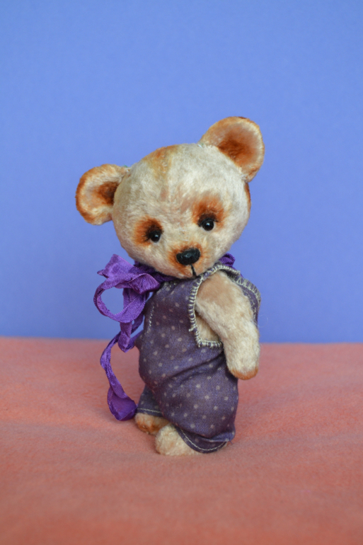 Мишутка сшит из старинного плюша ручной окраски. Рост 11 см. Полностью подвижен, головка на двойном шплинте. Утяжелен металлическимгранулятом. Одежка сшита их хлопка с шебби ленточкой. Глазки стекло. Тонирован пастелью и маслом. Может стоять и сидеть.