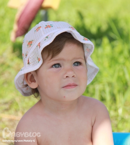 Маруся в деревне отдыхает, днем не спит...ягоды все вылезли на руках, но вроде без сыпи...Плещется в бассейне...